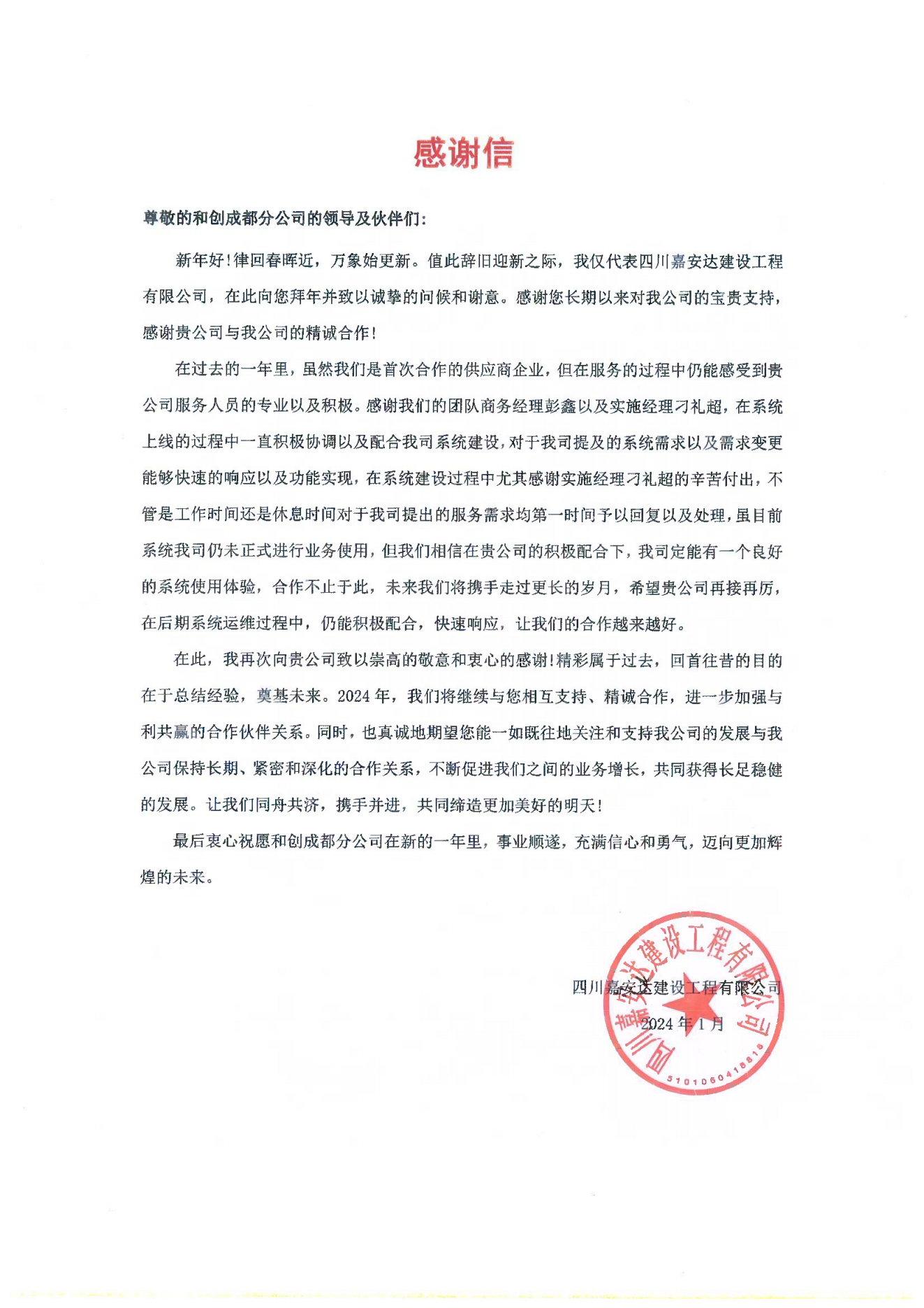 四川嘉安達建設工程有限公司向紅圈發來感謝信!客戶的認可是我們最大的動力!