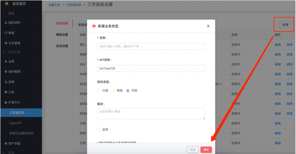 - 后臺(tái)設(shè)置:系統(tǒng)設(shè)置——擴(kuò)展中心——已安裝應(yīng)用——工作報(bào)告,類型設(shè)置支持新建類型;在模板設(shè)置中,可以按業(yè)務(wù)類型設(shè)置不同的字段和統(tǒng)計(jì)值;統(tǒng)計(jì)值設(shè)置,支持自定義名稱;