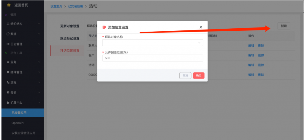 - 系統(tǒng)設(shè)置——擴(kuò)展中心——已安裝應(yīng)用——活動(dòng),增加了“拜訪位置設(shè)置”。新建拜訪位置設(shè)置,選擇拜訪對(duì)象、設(shè)置參考字段并設(shè)置允許偏差范圍