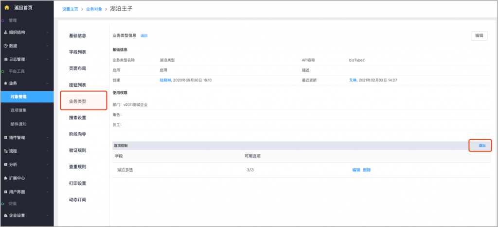 • 主對象業務類型控制子對象:主對象的業務類型可以控制子對象的單選及多選字段