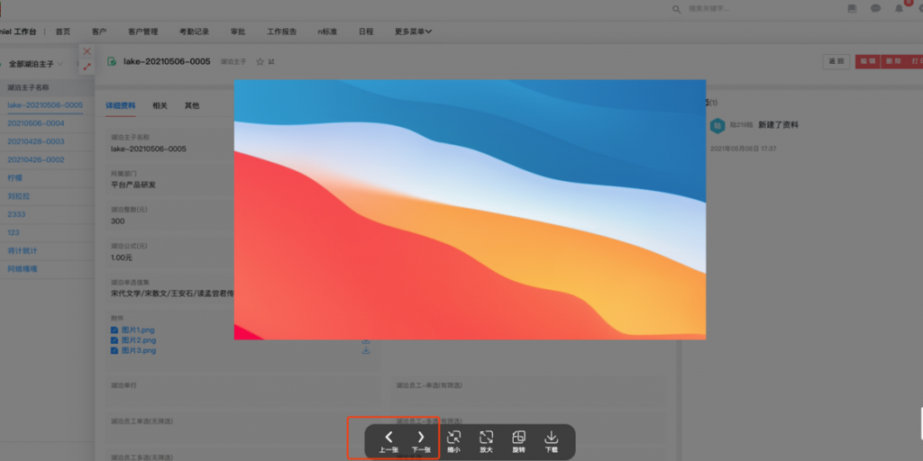 • 附件字段中的圖片預覽時可上下切換:附件字段中詳情頁的圖片在預覽時可以上下切換