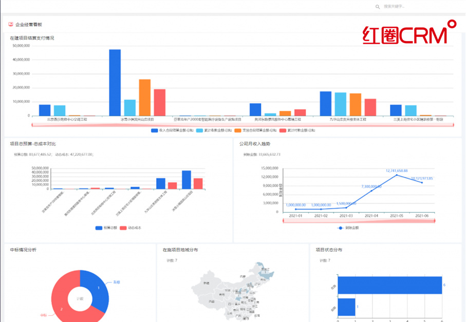 紅圈CRM v2.0專門服務于建筑工程企業項目管理,功能更聚焦于建筑工程項目經營,六大工程業務閉環,為建筑工程企業的經營結果負責。