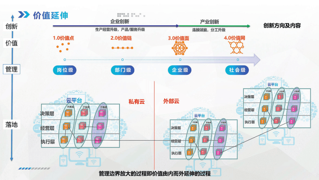 從管理到落地,可以將企業(yè)內(nèi)部的各類系統(tǒng)經(jīng)過抽象后統(tǒng)稱為該企業(yè)的“一朵云”(平臺),這個(gè)“云平臺”的組成包括:系統(tǒng)(系統(tǒng)之下可以有子系統(tǒng))、管理模塊、工作單元、工作場景、管理節(jié)點(diǎn)和管理信息因子。從圖中可以看出系統(tǒng)內(nèi)部的模塊間、系統(tǒng)之間的模塊間都是有關(guān)聯(lián)的。企業(yè)的“云平臺”部署在私有云,而生態(tài)伙伴的“云平臺”部署在外部云,每朵“云”之間借助模塊的關(guān)聯(lián)形成了一個(gè)合作體系。隨著這種體系落地的過程,實(shí)現(xiàn)了價(jià)值向外的延伸、也實(shí)現(xiàn)了管理的向外延伸,管理邊界的放大過程就是價(jià)值由內(nèi)而外延伸的過程。數(shù)字化轉(zhuǎn)型不僅僅是“一朵云”落地,云和云之間互聯(lián)互通。
