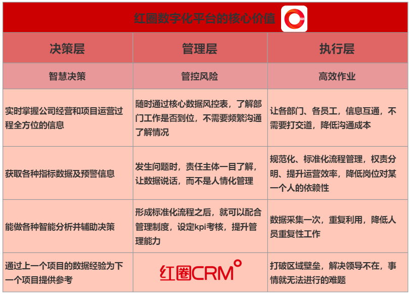 紅圈工程項目管理系統(tǒng)可實現(xiàn)數(shù)字管理。數(shù)據(jù)資產(chǎn)沉淀和分析,?撐組織決策。 服務(wù)于企業(yè)階段性目標的達成。 以組織建設(shè)、?才選拔,人才復(fù)制,提升組織能力。