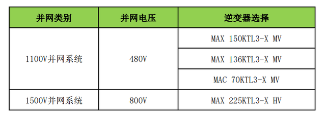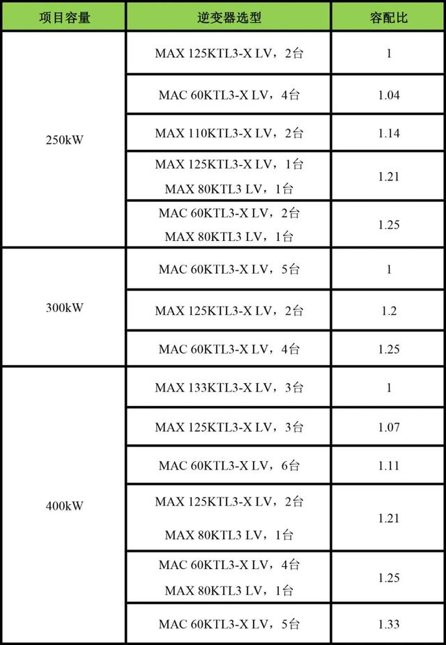 (1)對于不大于400kW的低壓并網工商業電站,可以采用多臺組串式逆變器并聯的方式,逆變器盡量選用功率大的,以下為比較常見的并網點容量,可以根據不同的容配比需求合理選擇配置方案。