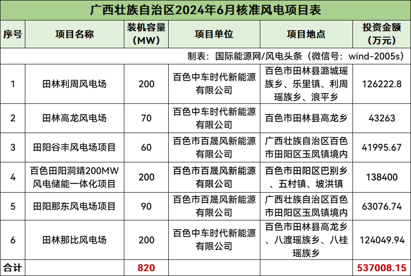 廣西核準(zhǔn)6個(gè)風(fēng)電項(xiàng)目,總規(guī)模820MW,總投資537008.15萬元,均為陸上風(fēng)電項(xiàng)目。