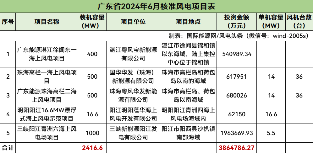 廣東核準(zhǔn)5個(gè)風(fēng)電項(xiàng)目,總規(guī)模2416.6MW,總投資3864786.27萬元,均為海上風(fēng)電項(xiàng)目。