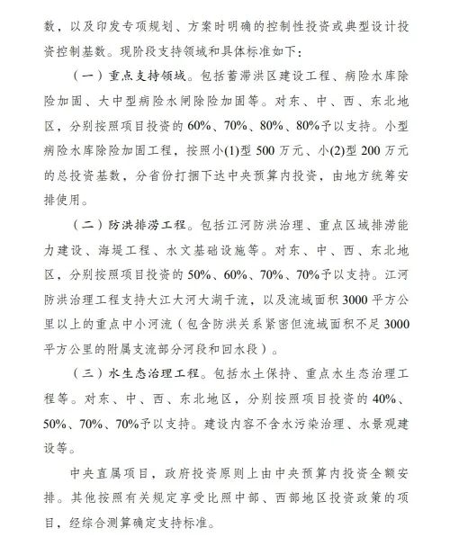 防洪排澇工程。包括江河防洪治理、重點區(qū)域排澇能力建設(shè)、海堤工程、水文基礎(chǔ)設(shè)施等。對東、中、西、東北地區(qū),分別按照項目投資的50%、60%、70%、70%予以支持。江河防洪治理工程支持大江大河大湖干流,以及流域面積3000平方公里以上的重點中小河流(包含防洪關(guān)系緊密但流域面積不足3000平方公里的附屬支流部分河段和回水段)。