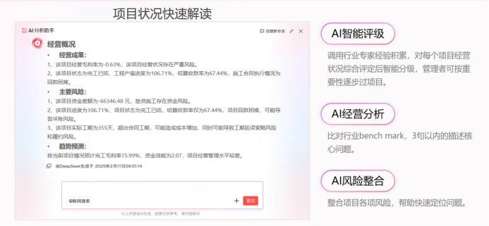 紅圈AI系列智能產品中的項目360°AI解讀,通過整合全維經營指標,一鍵生成項目全景作戰圖,讓復雜數據轉化為清晰決策語言。該功能能夠對項目經營狀況進行智能評級,并整合各項風險,幫助管理者快速定位問題。通過結構化呈現項目關鍵信息、收支分析、資金分析和成本構成等數據,項目360°AI解讀使項目進度監控更加精準高效。這種透明化的進度跟蹤,不僅提高了項目執行效率,也降低了因延期導致的額外成本。