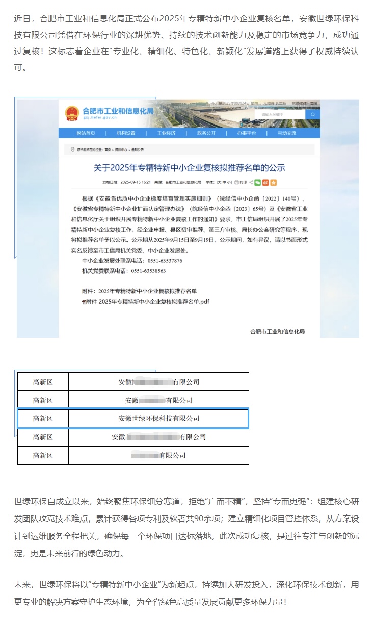 世綠環(huán)保成功通過“安徽省專精特新中小企業(yè)”復(fù)核,以專業(yè)守護綠水青山!