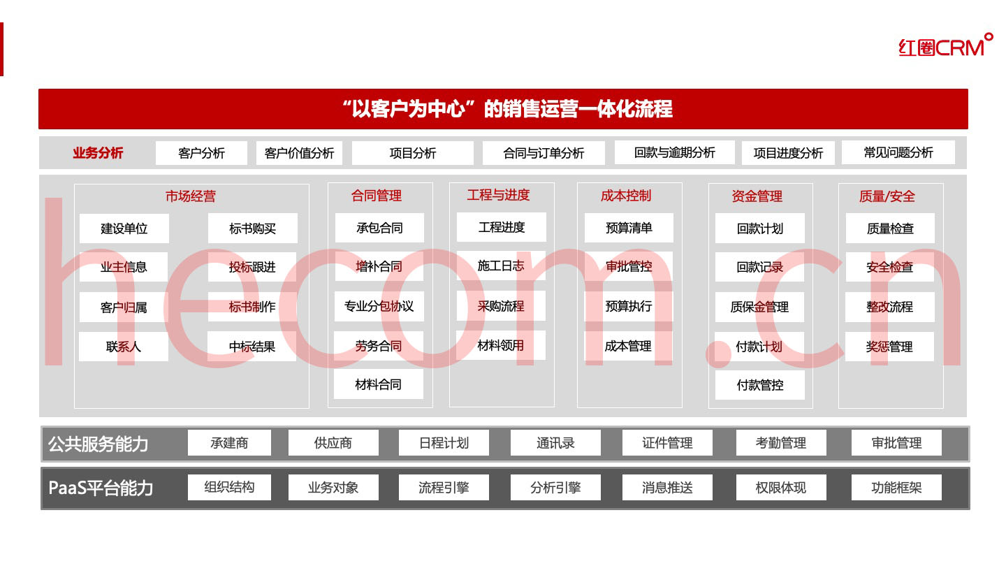 裝飾工程企業的管理特性復雜多變,因為項目都是分散的,只能依附人員進駐現場管理。而且裝飾工程企業的項目涉及的材料種類也很多。所以,這一類企業選擇項目管理系統,要有針對性。系統提供商一方面要了解裝飾工程行業的管理特性,另一方面,系統要有很強的適應性,能滿足該行業企業多變的管理特性。紅圈借助互聯網、云計算、移動大數據等技術,基于自主研發的紅圈 PaaS 平臺推出了紅圈 CRM 裝飾工程項目管理系統,針對性的滿足裝飾工程企業的管理需求,適用于公裝工程、幕墻工程、鋼結構、弱電工程、防腐保溫等行業企業。